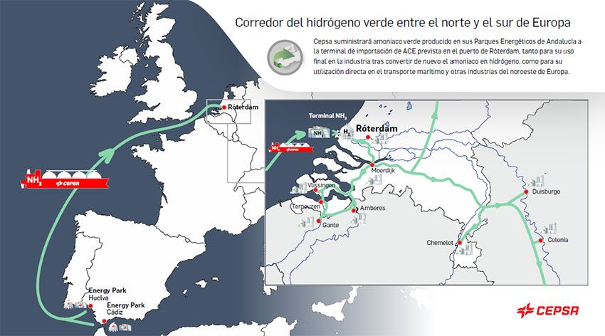 En esa línea, Cepsa ha llegado a un acuerdo con ACE Terminal (un consorcio formado por las empresas Gasunie, HES International y Vopak). El acuerdo contempla la distribución de amoniaco verde a la terminal de importación prevista en el Puerto de Róterdam. Su uso final será, entre otros, la industria, tras convertir el amoniaco de nuevo en hidrógeno verde.