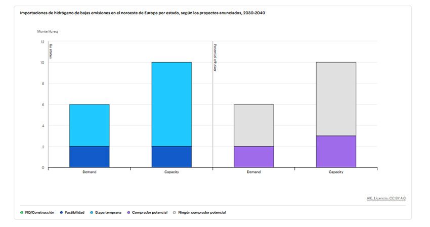 Según la base de datos de proyectos de producción de hidrógeno de la AIE: la producción de hidrógeno de bajas emisiones y sus derivados en el noroeste de Europa podría superar los 7 millones de toneladas/año para 2030. Pero sólo en el caso de que todos los proyectos planificados entran en funcionamiento comercial. Esto cubriría aproximadamente el 2% de la demanda total de energía primaria de la región.