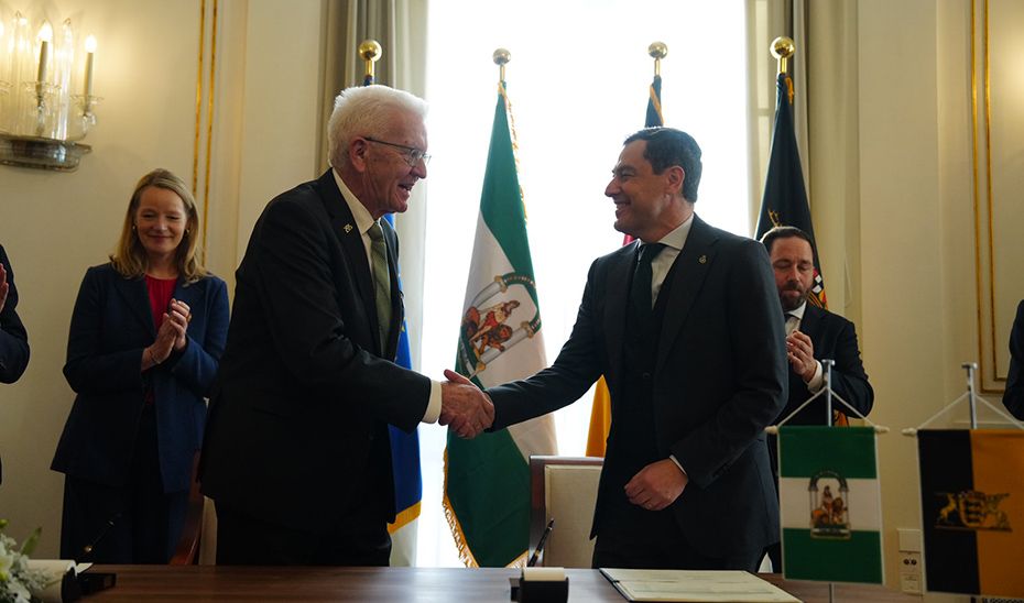 Moreno ha firmado en Stuttgart (Alemania), junto al ministro-presidente del estado federado de Baden-Württemberg, Winfried Kretschmann, la hoja de ruta para el desarrollo del Protocolo de Colaboración entre la Junta de Andalucía y este estado alemán, avanzando así en el acuerdo que ya firmaron en octubre del pasado año y que tiene como objetivo la lucha contra el cambio climático y el desarrollo de las energías verdes.