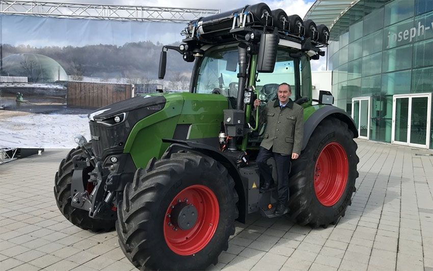 Hubert Aiwanger , ministro de Estado de Asuntos Económicos, Desarrollo Regional y Energía de Baviera, junto al prototipo de Fendt. Foto: Fendt.