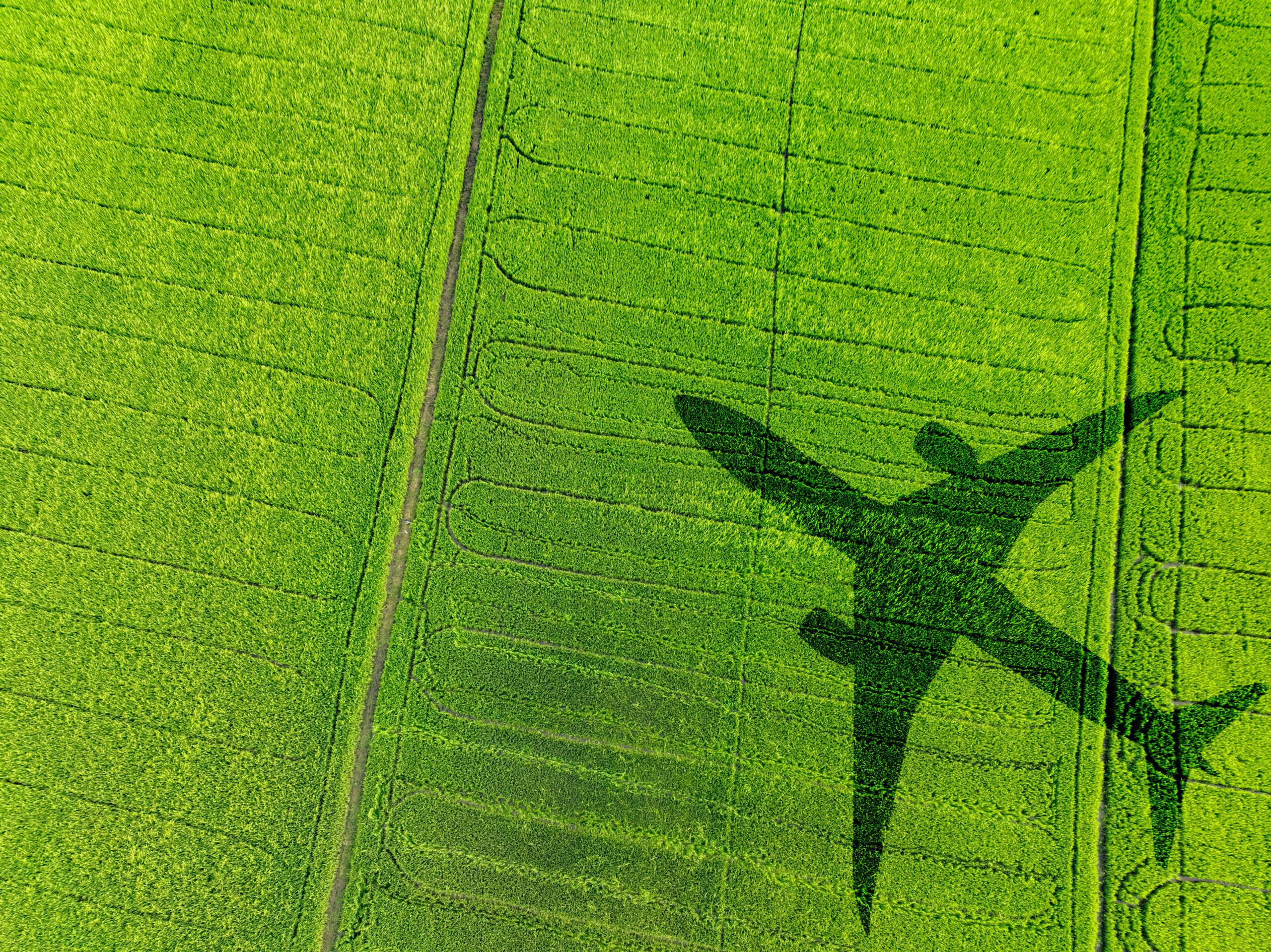 Shadow airplane flying above green field. Sustainable fuel. Biofuel in aviation. Sustainable transportation and eco-friendly flight with biofuel use. Aviation sustainability. Biofuel in air travel.
