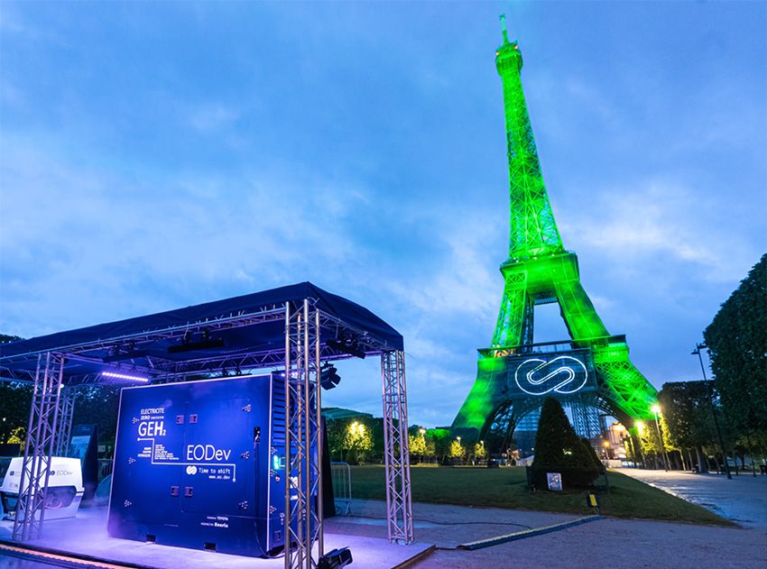La iluminación de la torre procedió de un grupo de electro-hidrógeno, cero emisiones, desarrollado por EODev. En cuanto al hidrógeno, renovable certificado, lo suministró Air Liquide, uno de los socios de la exposición que se celebra actualmente en París.