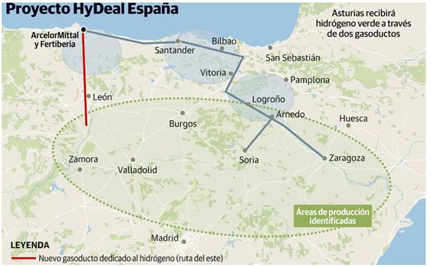 Anunciado en febrero de 2022, HyDeal España es un consorcio industrial formado por ArcelorMittal, Enagás, Grupo Fertiberia y DH2 Energy, creado para suministrar hidrógeno renovable y a precio competitivo a un importante complejo industrial situado en Asturias. La producción de este hidrógeno se llevará a cabo a través de plantas solares situadas en la mitad norte de España, cuya capacidad total instalada se espera que alcance los 9,5 GW de energía solar y los 7,4 GW de electrolizadores.