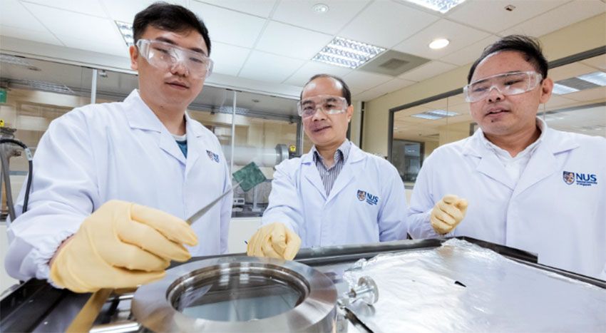 Equipo de NUS descubridor del hallazgo: Prof. Xue Jun Min, en el centro; Zhong Haovin, izquierda; Dr. Vincent Lee Wee, derecha.
