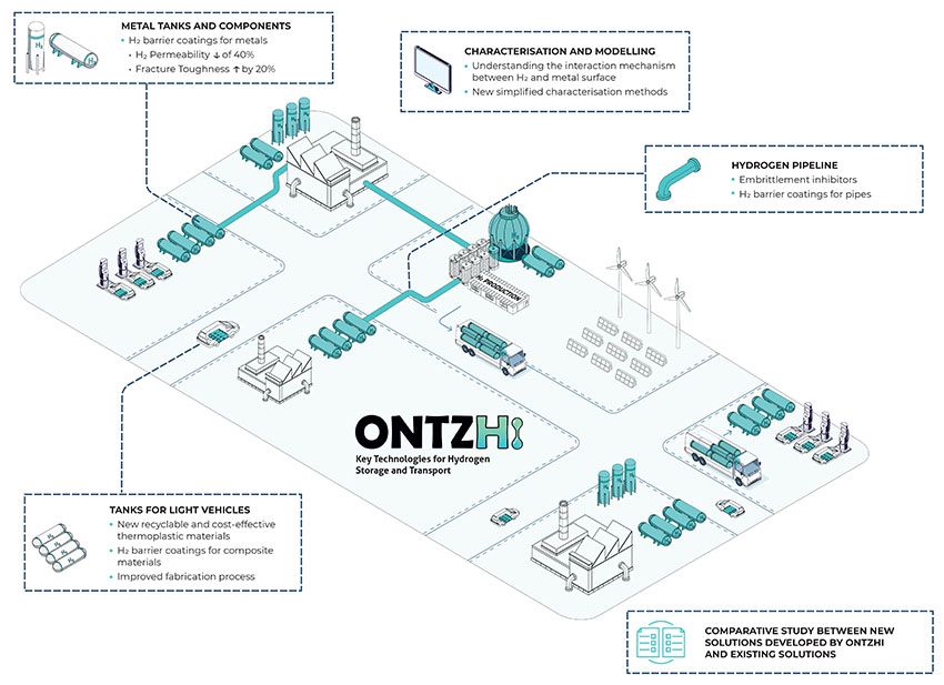 Así nace el proyecto centrado en hidrógeno ONTZHi. Quiere contribuir a resolver los diferentes tipos de almacenamiento y transporte (estacionario o móvil) y el estado en el que se encuentra (gaseoso o líquido). Se enfoca en cuatro líneas de trabajo: Tanques y componentes metálicos (principalmente para uso estacionario), tanques para vehículos ligeros, tuberías de distribución y nuevos métodos de caracterización avanzados.